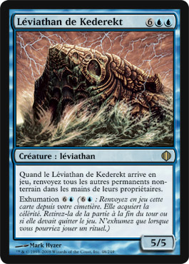 | Quand le Léviathan de Kederekt arrive sur le champ de bataille, renvoyez tous les autres permanents non-terrain dans les mains de leurs propriétaires. Exhumation ![]()   (![]()   : Renvoyez cette carte depuis votre cimetière sur le champ de bataille. Elle acquiert la célérité. Exilez-la au début de la prochaine étape de fin ou si elle devait quitter le champ de bataille. N'exhumez que lorsque vous pourriez jouer un rituel.) |