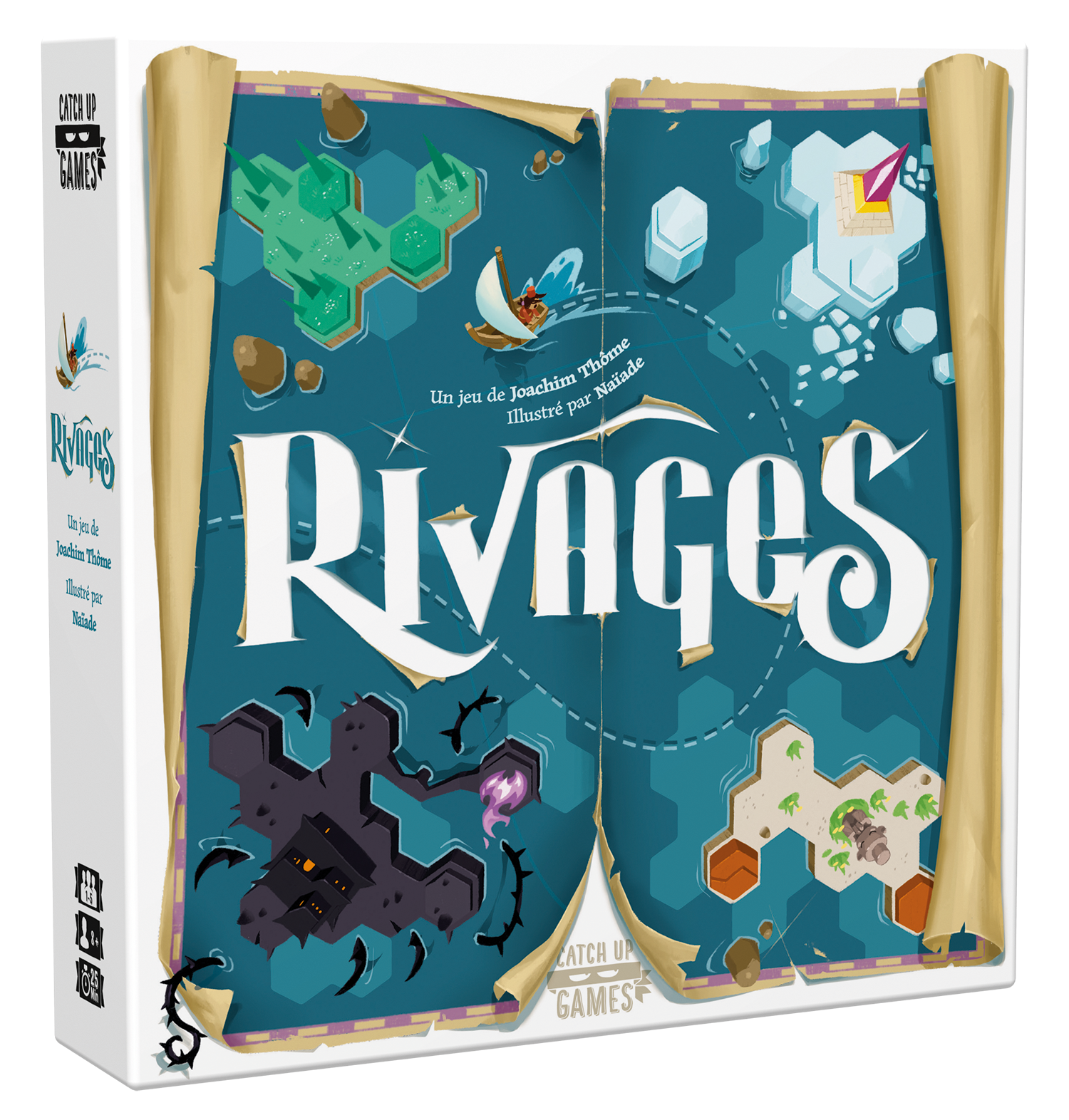 Rivages est un jeu d’exploration dynamique dans lequel les joueurs naviguent d’îles en îles à la recherche de parchemins anciens. À chaque tour, ils choisissent simultanément une de leurs deux cartes Exploration pour cocher les cases correspondantes sur l’île qu’ils explorent.