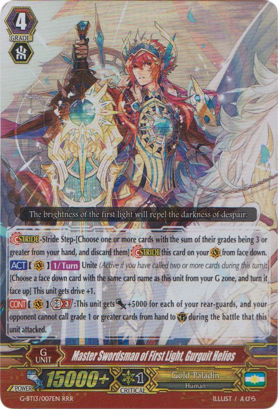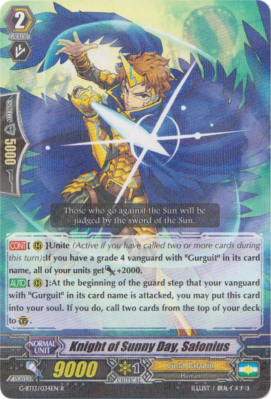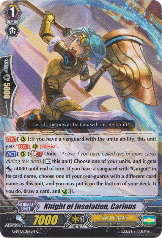 Une des futures cartes maîtresse du deck, ce chevalier d'or offre deux possibilités. Soit en Unite, l'ensemble de vos unités gagnent + 2 000 de puissance en continue si vous avez un Grade 4 avec Gurguit dans son nom, soit en Guard Step où il passe dans la soul de votre Vanguard et call les deux cartes du dessus de votre deck en Shield, de quoi activer directement le Unite durant le tour adversaire (car oui, l'Unite marche durant le tour des joueurs). Alliant l'attaque et la défense, cette unité sera très utile contre certain deck qui voudrait vous empêcher de Guard par certaine restriction.