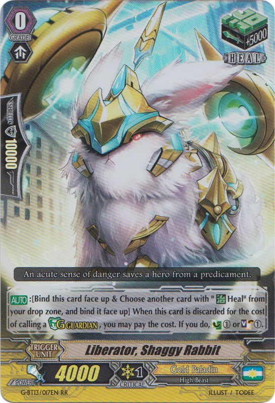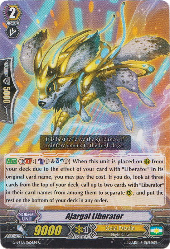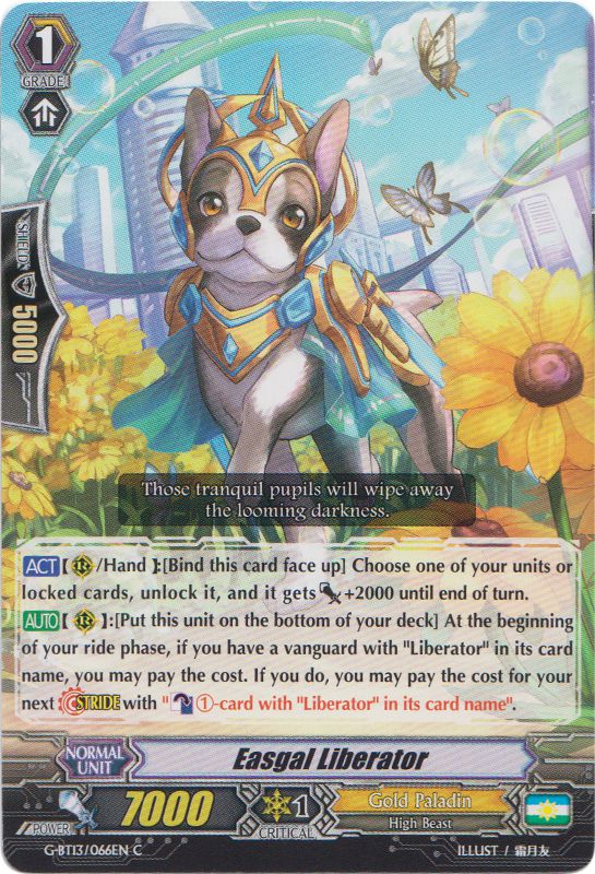 D/a1ajJNvGSc3/s/GNiZOLqlxpR/Z2wYvHYi7ovuwbFIJA1ItjPnfSScVglvO2bPSnPU4Yx5Bx5hYEVwU7ARew==G-BT13/066 Easgal Liberator (G1) : Encore un chien (il faut savoir que les High Beast sont la spécialité des Liberator) qui nous offre cette fois deux choix. Le premier est de le Bind depuis la main ou le terrain pour choisir un cercle ; s'il est lock, vous pouvez le Unlock et lui donner 2 000 de puissance. En deuxième choix, vous pouvez la mettre sous votre deck depuis votre terrain, Counter Blast 1 une carte avec Liberator, et ensuite Stride une carte sans payer le coût si vous avez un Vanguard avec Liberator.
