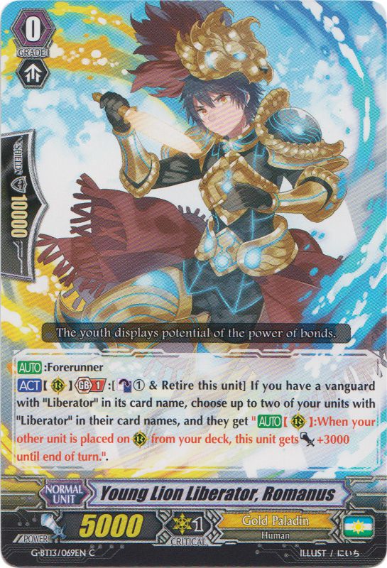 30acASS/7aLBZDpxKPC6exTsqGS+FpFFY3A360Z+nOUPQJfqVGo/5u9FRJypwtqrPQ+yQRNn3eiYiy25VlVrAG6Z3gnj3ZGAXg0909XsVtA=G-BT13/069 Young Lion Liberator, Romanus (G0) : Un beau gosse qui offre la possibilité de faire des attaques très puissantes. Pour ça, rien de plus simple, vous le retirez et Counter Blast 1, vous choisissez deux unités, et jusqu'à la fin du tour, les deux unités gagnent + 3 000 de puissance à chaque fois qu'une carte est invoquée du deck. Une carte très intéressante, je vous la conseille en starter.