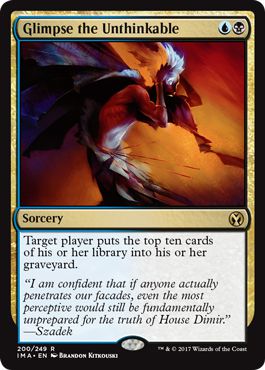 Gros spoiler à sa sortie, quasi introuvable pour le petit joueur que j'étais, je trouve que RdEsPS1m21Gg9xq26JdO/kw0KzMStMF0RJSO5M3L/Ht8F3lxGZoxXUxKOFXdTn4o3R53kITKexrSZO0HhtNK9A==Glimpse the Unthinkable a pas mal perdu en passant au Modern. Certes, on parle d'une liste meule de temps en temps, mais rarement dans le top du classement. Bon...