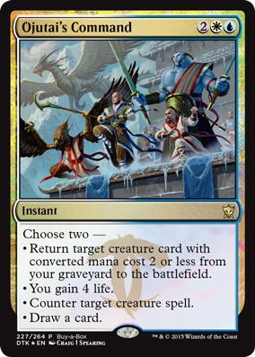 | Choisissez deux — • Renvoyez sur le champ de bataille depuis votre cimetière une carte de créature ciblée avec un coût converti de mana inférieur ou égal à 2. • Vous gagnez 4 points de vie. • Contrecarrez le sort de créature ciblé. • Piochez une carte. |