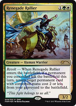 Voix du Renouveau sur le champ de bataille > lancement d'Evolution hermétique en sacrifiant la Voix > Création d'un token Elemental 1/1 > Chercher Rallieur renégat pour le mettre en jeu > Activation de la capacité Révolte > Ramener la Voix du Renouveau depuis le cimetière >>> Etre frais comme un gardon avec en jeu Voix, Rallieur et un token Elemental 3/3
