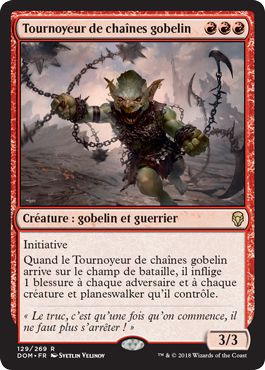 Une dernière petite remarque sur ce deck ? Oui, la présence du +nLlNgmz6tTIChXWKvIsdfz+BAQEdKfBHP5RTdL4MvzcAe3ab+5u8Qsill31R0e0ue9evg2YxB24U0G7diBfNZQe/Qih44ZslcuyquGp5WY=Tournoyeur de chaînes gobelin qui semble peu indiqué contre un deck Contrôle (surement à sider à la seconde partie) mais qui fera des merveilles avec l'initiative, et surtout qui permettra de raser un board de jetons, en espérant qu'il n'y ait pas de Lord sur la table ou d'Antienne-like (respectivement créatures et enchantement/artefact qui donnent +1/+1 à toutes vos créatures sous condition de type). En gros, même pour deux jetons 1/1, jouez-le ! Ça vous évitera d'avoir à gérer deux 3/3 le tour d'après !!