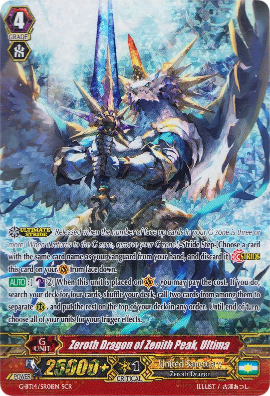 Pareil que son confrère AkRixTCOqYRT6tun+VFYazYuldTxMpAoQ4TbgaT1VK8RbhRbTWxSGGG9qi4XNE4PaZSNl6S67xj9dl4KDBiXxw==G-BT14/SR02 Zeroth Dragon of Inferno, Drachma, Ultima comprend pas mal de clans. Mine de rien, on en dénombre 6 à satisfaire (Royal Paladin/Gold Paladin/Shadow Paladin/Genesis/Oracle Think Tank/Angel Feather). Penchons-nous ensemble sur cette magnifique nation qu'est l'United Sanctuary (favoritisme ? Jamais !). Son joli Dragon lui offre un effet assez original car il permet de choisir 4 cartes de votre deck, d'en invoquer deux et de mettre les deux autres au-dessus du deck. De plus, jusqu'à la fin du tour, l'ensemble des unités sont affectées par les effets de Triggers (par exemple, si vous Drive Checker un Stand, toutes vos unités gagnent 5 000 de puissance et l'ensemble de vos unités se re-stand).