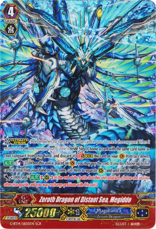Pour être honnête, je suis assez tiraillé entre les 2ème et 3ème places de ce classement, néanmoins je pense que les possibilités offertes font valoir leurs places à chacun. Parlons maintenant du Dragon des 7 mers. Megiddo est donc le dragon représentant la Megallanica, et sans mauvais jeu de mot, il va vous faire boire la tasse (je sens le vent pour cette blague… Ok je sors). Ce majestueux dragon de 50 mètres de haut vous permet d'invoquer jusqu'à 5 cartes de votre Drop Zone sur votre terrain quand il arrive, et l'ensemble des unités invoquées gagne 5 000 de puissance. Qui plus est, à la fin de l'attaque d'une de vos unités, cette unité peut échanger sa place avec une autre unité sur votre terrain.