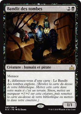+tjksOFql0i9agR8b/BDvD0xwSzEZD5EjMPO/3KLbdbTqdYI9mIxCWYSTJkzUMaSBandit des tombes : ajout potentiel pour un deck jouant principalement sur le cimetière et son gavage (Réa, Meren, Gitrog), mais ce bandit me semble trop cher et fragile. Pour un CCM de 3, l'un et l'autre pack ont sans doute autre chose de mieux à faire, limitant le build à des créatures réellement importantes. Toutefois, on peut activer sa capacité dès son arrivée en jeu, et le bandit dispose de la Menace tout en grossissant grâce à Explorer. Ce peut donc être un bon outil.