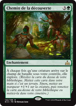 rhuqTV1JN9ZzwxLrREGYd00VNlt+g+ZfUvJgLDVvvR6BykBu3vSq3JSNrx9ML4bZj52I+1akZ+C99kQStU0odg==Chemin de la découverte : quand on connait la force de chaque créature qui explore (voir ci-dessous), on ne peut qu'être stimulé par ce nouvel enchantement. Quand on joue aggro, notre main est vite réduite à peau de chagrin assez tôt dans la partie. Ce voyage donne la possibilité de rentabiliser chaque créature arrivant en jeu, à condition bien entendu de jouer une créa et qu'elle ne soit pas contrecarrée. Avoir une main quasi-stable et auto-régénérante est un gage de succès. Cet enchantement n'est rentable cependant que dans un jeu avec une forte densité de créatures (entre 35 et 40 environ), on ne le trouvera donc que dans certaines listes. Et, dans un build Token, c'est de l'indécence à l'état pur. Pour compléter, on peut nommer le rituel uK36xKXAgAnNN6RUTnWpLuqClCylfFi05N4pIlYF+Usc+IIcXzMhT1FYuwSZBzFlSaut dans l'inconnu, permettant de Scry 1 + jouer un land supplémentaire. C'est un bon outil pour gérer sa pioche et ramper, mais dépend de la présence d'une créature sur le champ de bataille. Je préfère pour ma part jouer un elfe à mana, au moins suis-je sûr du résultat.