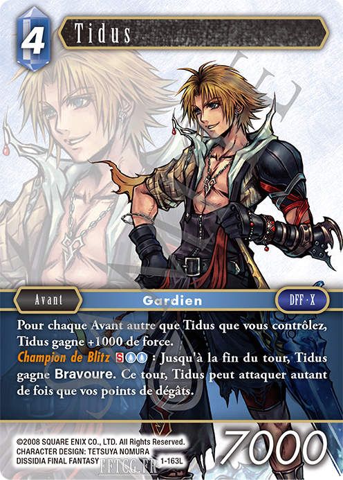 La formulation "Ce tour, Tidus peut attaquer autant de fois que vos points de dégâts" signifie que lorsqu'il utilise sa compétences spéciale, Tidus peut alors attaquer durant un tour avec un nombre d'attaques maximal égal au nombre de cartes que vous avez dans votre Damage Zone. Comme pour Gilgamesh 1-128R, les attaques doivent être déclarées séparément et se résoudre chacune avant de pouvoir éventuellement lancer la suivante si le joueur le souhaite toujours.