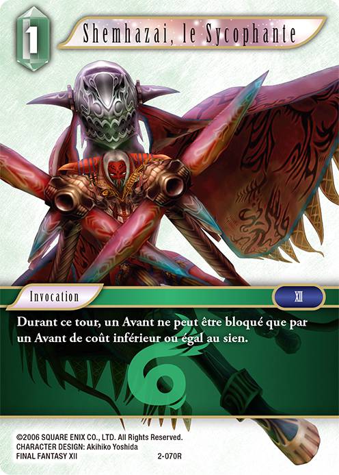 On pourrait penser que cet effet n'est utilisable que lors du tour du joueur de Shemhazai, mais ce n'est pas forcément le cas puisqu'il existe des Avants qui sont eux-mêmes obligés de bloquer s'ils le peuvent, comme Cecil 2-129L, et d'autres qui peuvent vous forcer à bloquer si vous le pouvez, comme Ba'gamnan 2-088C.