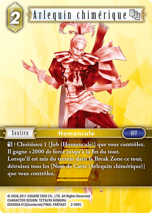 La formulation "Lorsque l'Avant ciblé est mis dans la Break Zone durant ce tour, détruisez tous les [Arlequin Chimérique]" signifie que si vous avez activé la compétence d'action d'un Arlequin chimérique que vous contrôlez sur un Avant et que cet Avant quitte le terrain vers la Break Zone, tous les soutiens de nom [Arlequin Chimérique], même s'ils n'ont pas été activés, le suivront dans la Break Zone également.