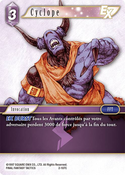 Si par exemple vous avez un Avant sur votre terrain, par exemple le Kain 2-103H cité précédemment, et qu'il a subit 4000 points de dégâts avec un Ifrit 1-004C, si votre adversaire lui fait perdre 3000 points de force avec cette Cyclope, il devient alors un Avant ayant 2000 points de force et ayant subi 4000 points de dégâts. Sa force étant inférieure aux dégâts subis, il est donc détruit et mis dans la Break Zone.