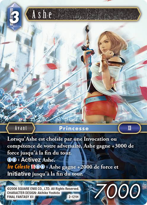 Un simple rappel ici : pour la première compétence qui augmente de 3000 points la force de Ashe quand elle est ciblée par une compétence ou une invocation, il est utile de noter que dans le cas d'un Ex Burst, puisqu'on ne peut pas répondre à cet Ex Burst, la compétence est déclenchée après la résolution de ce dernier. Donc un Brynhildr 1-023R en Ex Burst détruira Ashe, par exemple.